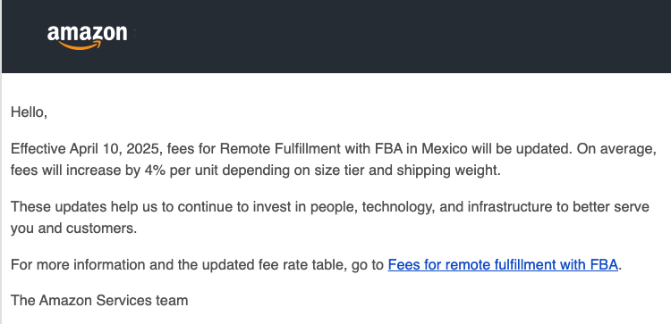 Starting April 10, 2025, Amazon is raising Remote Fulfillment fees in Mexico by an average of 4% per unit, citing increased investments in infrastructure and fulfillment operations.
