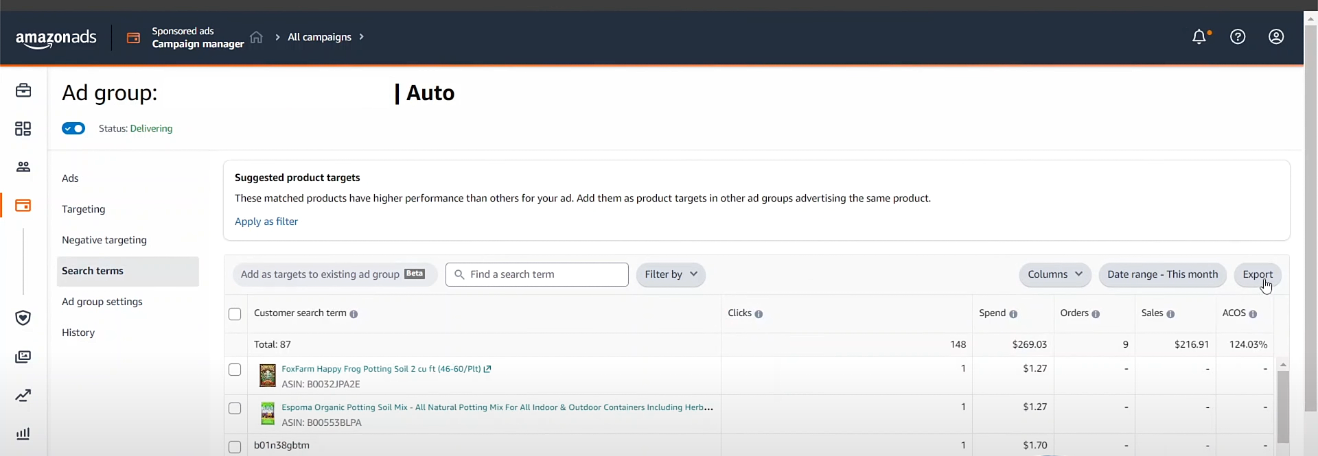 Click on one of the high ACoS campaigns. Inside: