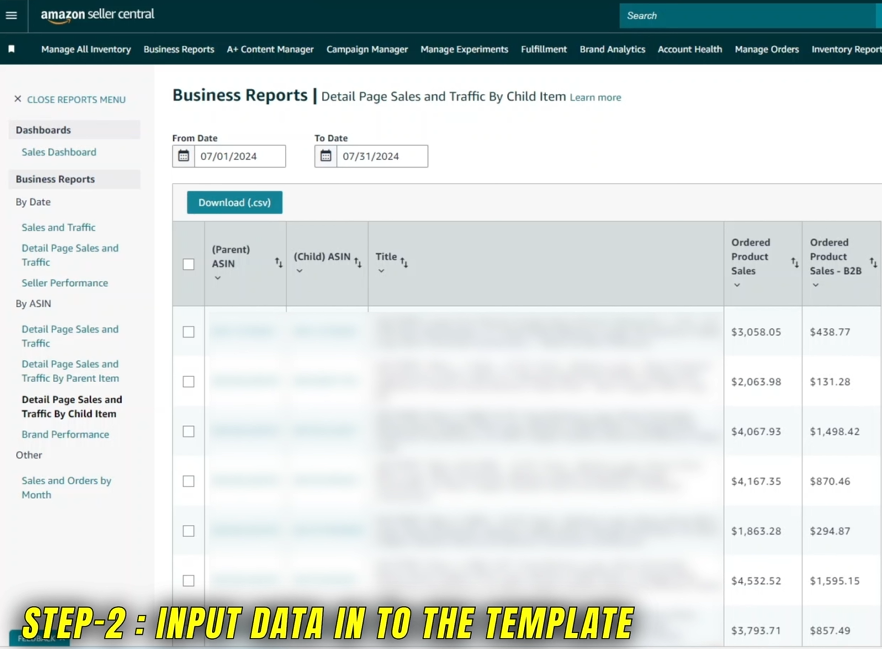 Download the Amazon sales report. The data will be in a format that can be opened in Excel or Google Sheets, allowing you to input it into your sales data template for Amazon for easier analysis.